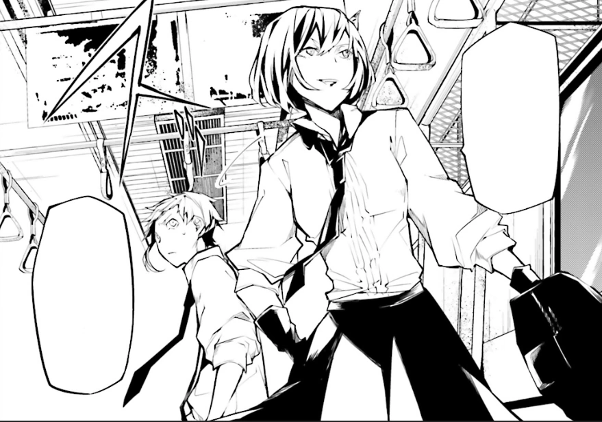 Suddenly, a train car explodes, causing the entire subway train to shake. The voice on the intercom continues talking, asking how many people could've died from such a blast, and that they hope to heighten that number during the next explosion. The voice on the intercom revealed to be a male with a bowl cut. The male says that if Atsushi doesn't hand himself over, then he'll give the passengers a one-way trip to heaven with a bomb planted at the back of the train. Dr. Yosano stands up, Atsushi frantically asking her what they should do. Dr. Yosano gives Atsushi 3 options. 1; get captured obediently, 2; jump off the train with as many passengers as possible, and 3; beat them up. They both agree on option 3, Dr. Yosano saying that after all, they are agency members.