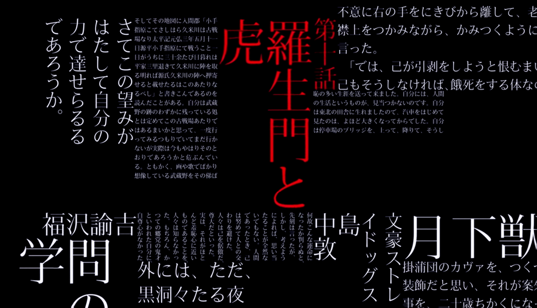 Rashōmon and the Tiger (羅生門と虎, Rashōmon to Tora?) is the 10th episode of Bungo Stray Dogs anime series. It aired on June 09, 2016.