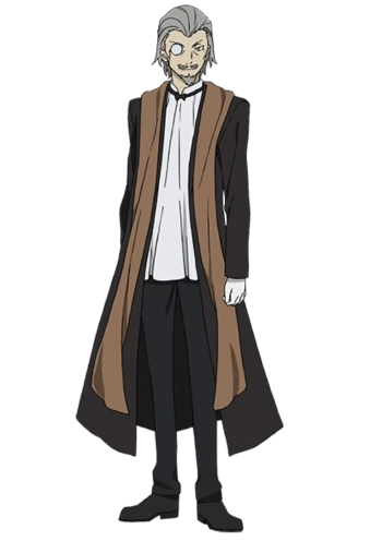 Hirotsu is a middle-aged man with grey, swept-back hair, a mustache, and a short beard ending in a spike. His eyes are violet, with a monocle over his right eye, secured by a gold chain.