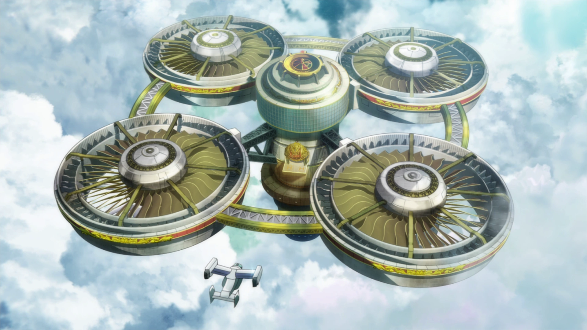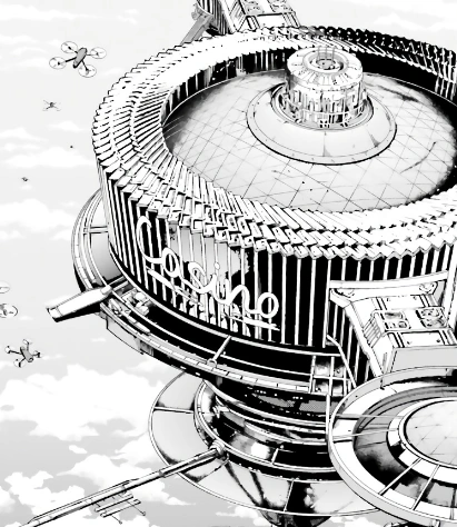 It is a high-altitude floating establishment built right after the war ended. It has helium and the centrifugal force from the mass balancer makes it possible to stay aloft with far less fuel than it appears to need.