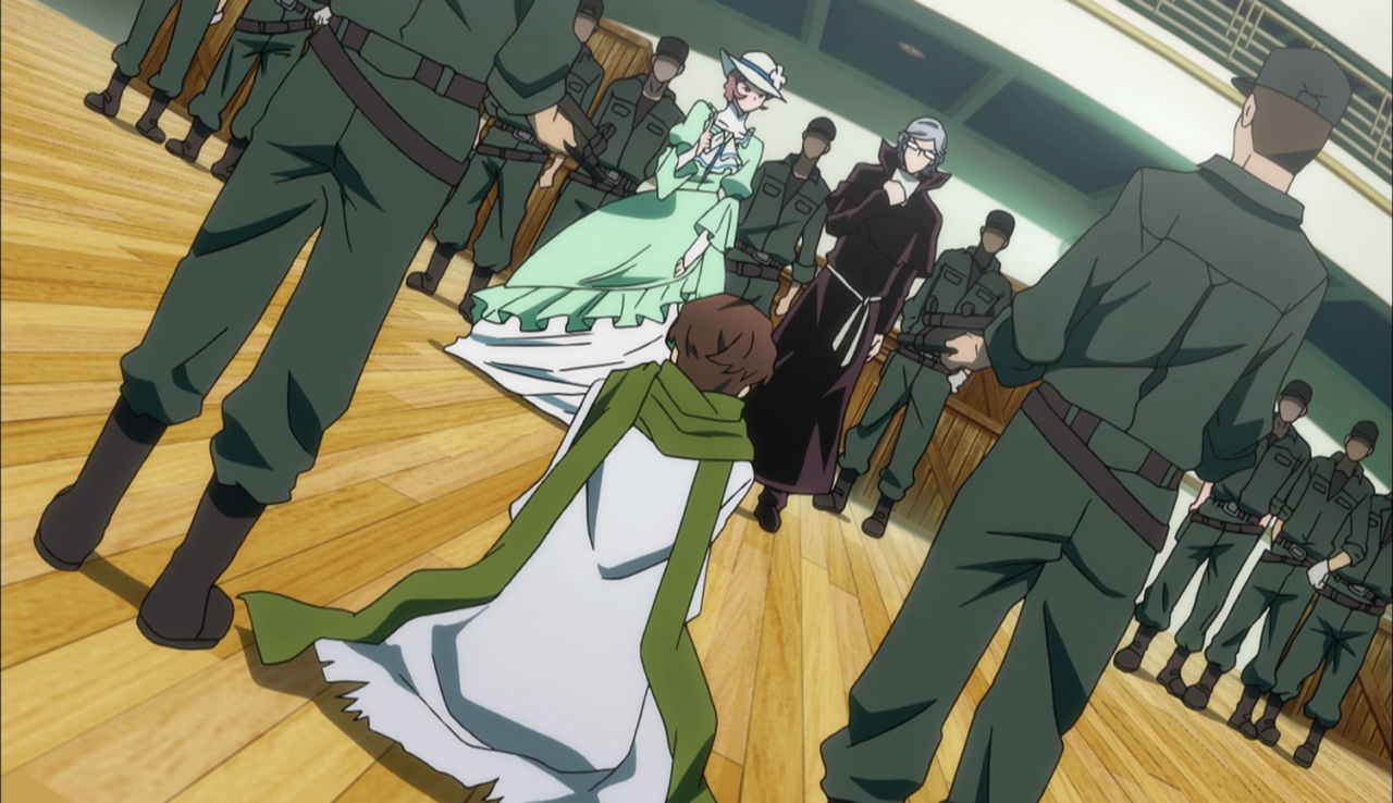 Meanwhile, the Guild plans their next operation at their headquarters. Atsushi visits the confined Kōyō and talks about Kyōka. Kōyō reveals that Dazai made deal with him tthat if they are able to find and rescue Kyōka, she will wait patiently and later on tells Atsushi to take care of her. Dazai meets up with Ango and reveals that the Guild is making their move. Ango responds that the Special Division for Unusual Powers have been keeping tabs on them as well - the Guild being a "secret society" and having diplomatic contacts. During their drive, Ango warns Dazai when a car crashes into them.